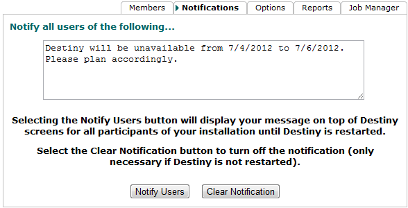 The message appears in a bar across the top of all Destiny windows, including the Welcome page. It does not appear, however, on a Follett wireless handheld device.